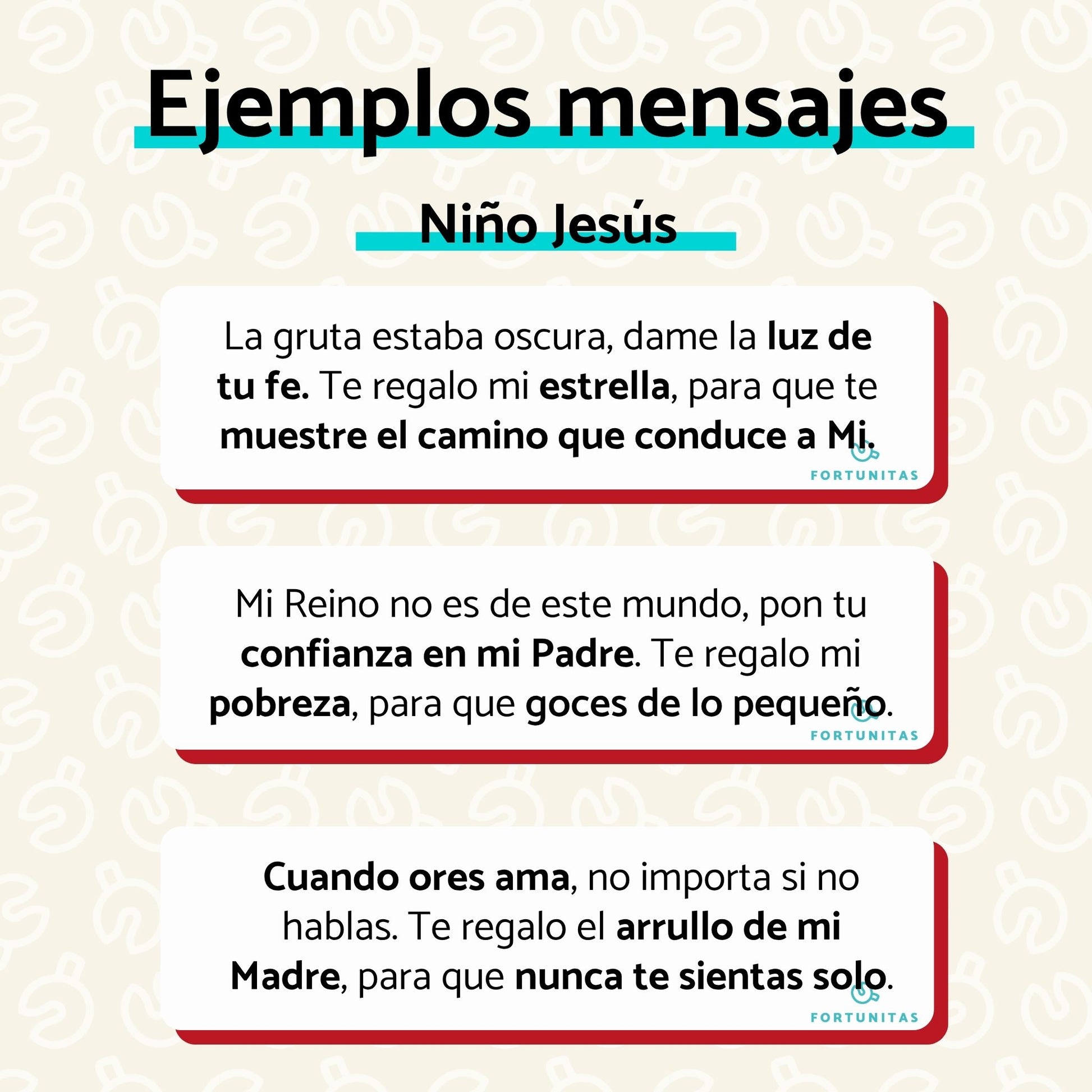 La caja contiene todo lo necesario para hacer la dinámica: las galletas con diferentes mensajes, el niño Jesús dentro de una de las galletas, una bolsa de organza para guardar al niño y una hoja con las instrucciones y una reflexión.