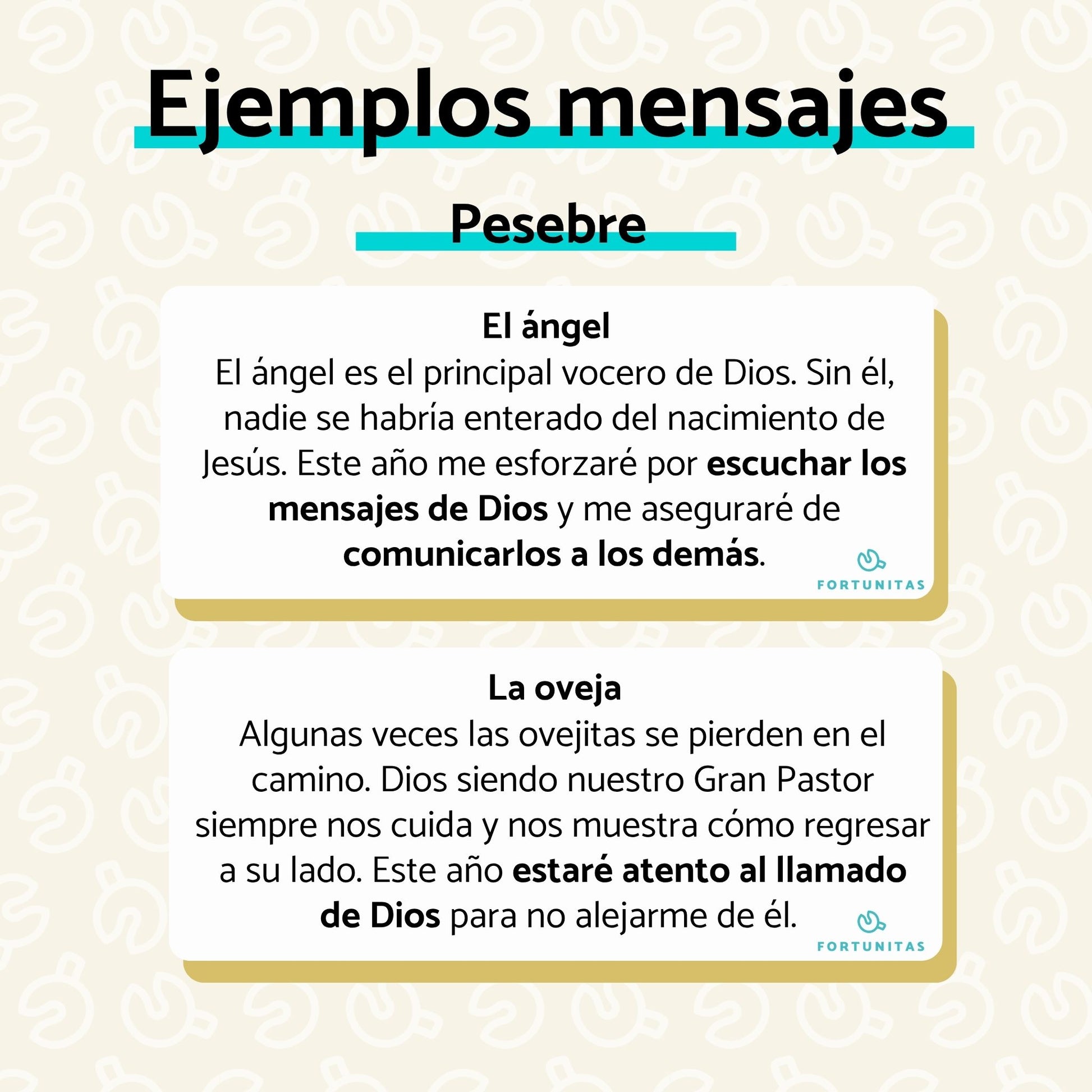 Cada galleta tiene una figurita de un personaje del pesebre y un mensaje relacionado la virtud que lo caracteriza, invitando a cada participante a imitar esa virtud durante el año.